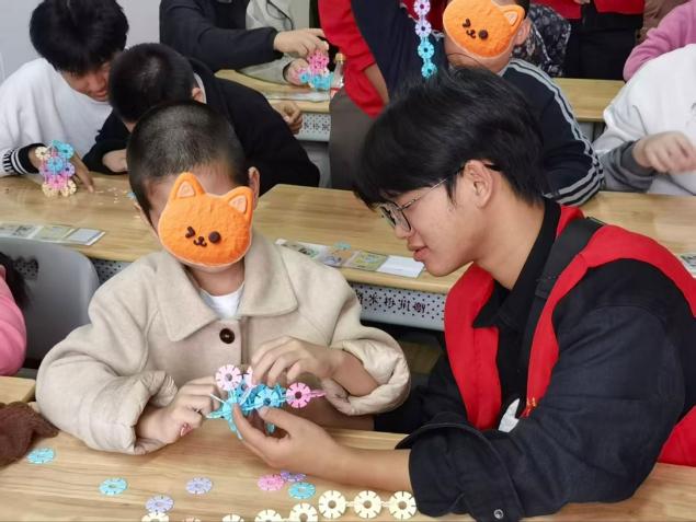 在普爱医院的室内活动区,一幕幕温馨的场景不断上演:志愿者们耐心地蹲下身,用温和的语气与孩子们一对一交流,尝试理解他们独特的肢体语言与表达方式;大家与孩子们并肩而坐,共同手持彩笔,在白纸上勾勒出绚烂彩虹、灵动小动物;五彩积木在协作中慢慢搭成“梦想城堡”,零散的拼图块也在耐心拼接下呈现完整画面。这些看似简单的互动,不仅是有效的康复训练,更是叩开孩子们心扉、建立信任的温暖桥梁。
